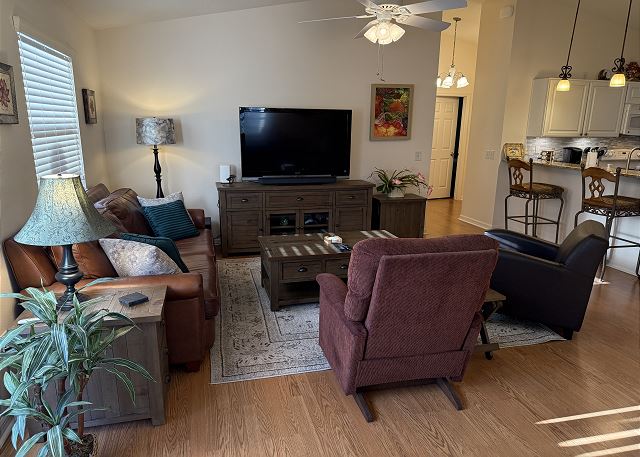 churches, cinemas, festivals, library, live theater, recreation center, restaurants, theme parks, winery tours, Satellite / Cable, Television, Air Conditioning, Clothes Dryer, Garage, Heating, Internet, Iron & Board, Linens Provided, Living Room, Towels Provided, Washing Machine, Desk, Wifi, Free Wifi, Wifi Speed 100+ Mbps, Desk Chair, Coffee Maker, Dishes & Utensils, Dishwasher, Ice Maker, Kitchen, Microwave, Oven, Refrigerator, Stove, Toaster, Dining Table, antiquing, bird watching, horseback riding, horseshoes, photography, walking, ATM/bank, fitness center, groceries, hospital, massage therapist, medical services, Resort, Lanai / Gazebo, Outdoor Grill, Communal Pool, basketball court, cycling, equestrian events, fishing, golf, golf privileges optional, swimming, tennis, children welcome, non smoking only, pets not allowed, Events Allowed, Minimum Age Limit for Renters, Senior Adults Only Community, flexible, recommended, Housekeeper Optional, Away From It All, Family, Outdoor lighting, Deadbolt lock on entryway, Smoke detectors, Fire extinguisher, Enhanced cleaning practices, Clean with disinfectant, No-contact check-in and check-out, High touch surfaces cleaned with disinfectant, Towels and bedding washed in water that's at least 60sC/140sF, 2 days (48 hours)